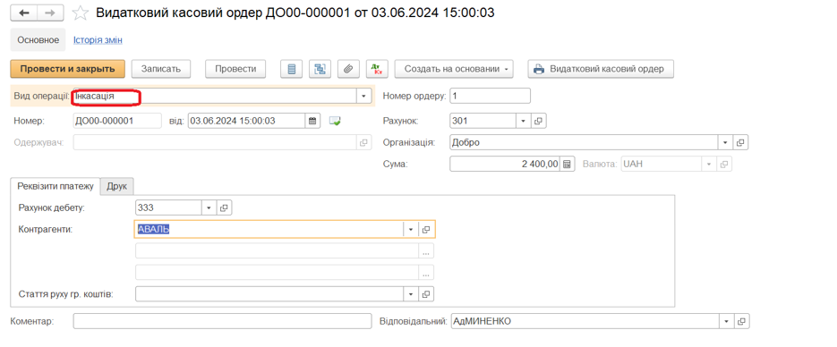 - Інкасація з каси підприємства оформлюється документом «Видатковий касовий ордер»: Інкасація