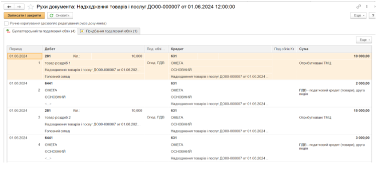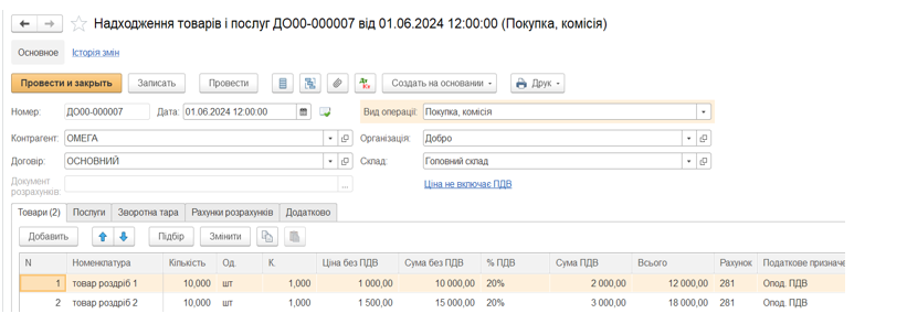 1. Документ «Надходження товарів та послуг». Оприбутковування на оптовий склад товару від постачальника.