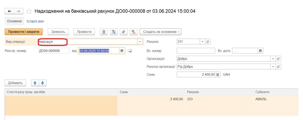 - Зарахування грошових коштів на банківський рахунок оформлюється документом «Надходження на банківський рахунок» : Інкасація – можна ввести на підставі документа «Видатковий касовий ордер»: Інкасація