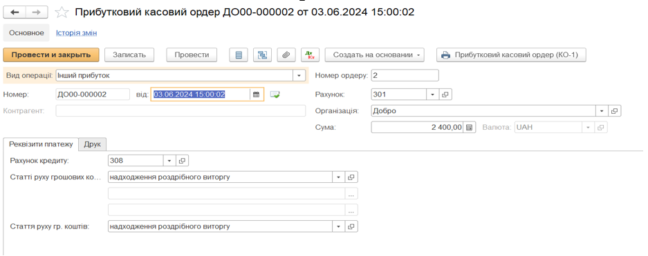 - Оприбуткування до каси підприємства оформлюється документом «Прибутковий касовий ордер»: Інший прибуток, (на підставі документа «Звіт про роздрібні продажі»)