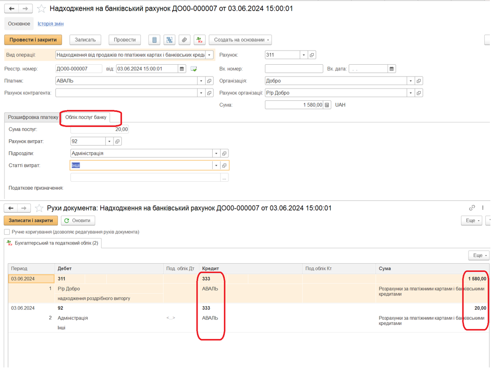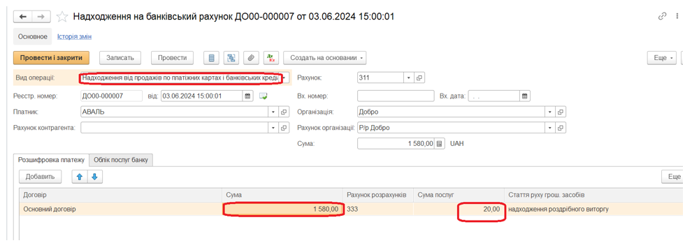 На закладці «Розшифровка платежу» вводиться договір з банком, сума грошових коштів, які надійшли, і сума банківських послуг.