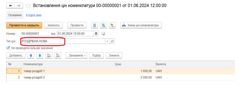 Документ « Встановлення цін номенклатури»