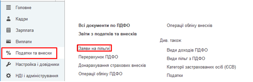 Рассмотрим порядок назначения налоговой социальной льготы (НСЛ) в конфигурации "BAS Зарплата та управління персоналом". Для ее назначения используем документ "Заявление на применение льготы по НДФЛ". Документ можно создать в разделе «Податки та внески», ссылку «Заяви на пільги» или по ссылке «Податок на доходи» в карточке сотрудника.