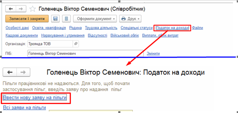 Рис. 2. Создание документа «Заявление на применение льготы по НДФЛ» через справочник «Сотрудники»