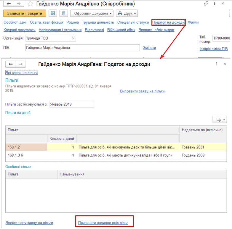 Для отмены льгот следует использовать отдельный документ «Отмена льгот по НДФЛ». Документ можно сделать в разделе «Налоги и взносы», ссылку «Заявления на льготы» либо по ссылке «Налог на доходы»-«Прекратить предоставление всех льгот» в карточке сотрудника.