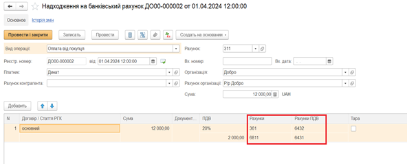 Д-т 361 К-т 702 - 12000,00 грн. (оказание услуг)