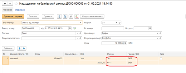 Д-т 311 К-т 361 - 12000,00 грн. (общая сумма оплаты от покупателя)