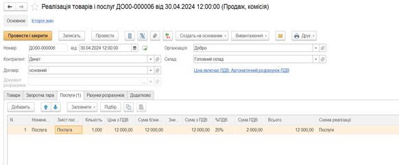 1. Документ «Реализация товаров и услуг» (реализация услуги покупателю)
